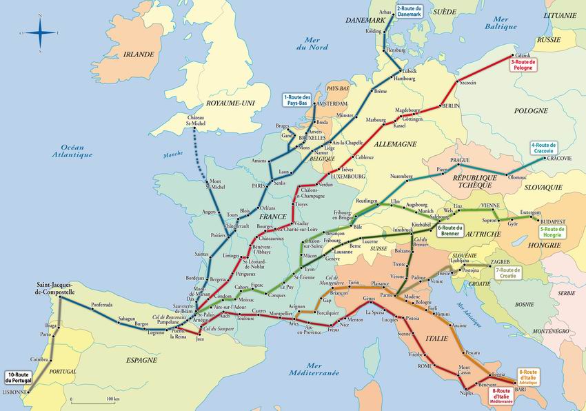 Carte tirée du Guide Européen des Chemins de Compostelle » de Jean Bourdarias et de Michel Wasielewski.